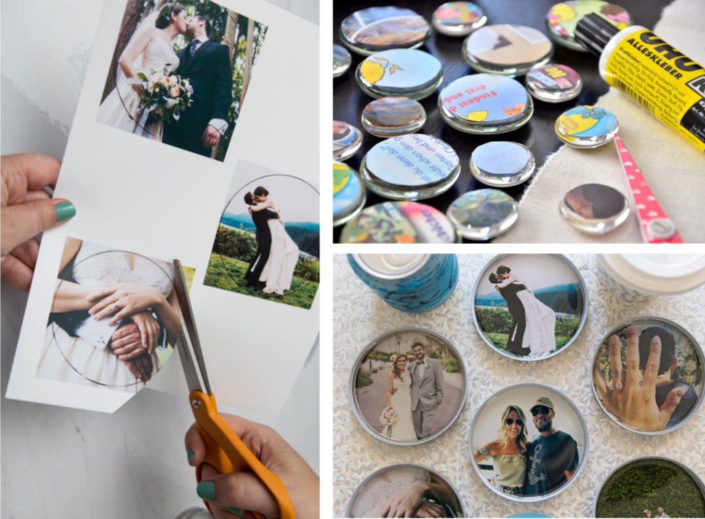 Nachdem Du die Fotos ausgedruckt hast, schneide sie entsprechend den Maßen deines gewählten Gegenstandes aus. Verwende den Gegenstand als Schablone, indem Du ihn auf das Foto legst und die Umrisse mit einem Stift nachzeichnest. Schneide dann entlang des Umrisses aus. Wenn Du einen Dosendeckel verwendest, sollte das Foto am Ende in den Deckel passen.